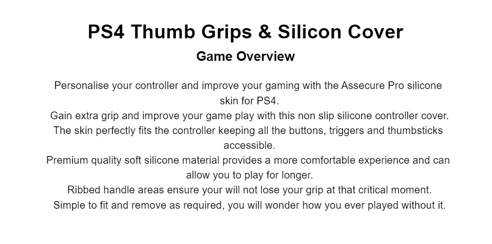 Click to expand Tap to zoom Thumb Grips & Silicon Cover for PS4 by Playstation Save ₱0.00 ₱350.00 | / White and Brown - Translation missing: en.products.status.sold_out White and Black - Translation missing: en.products.status.sold_out Light Blue - ₱350.00 Black and Red - Translation missing: en.products.status.sold_out White and Brown White and Black Light Blue Black and Red color_family 1 2 3 4 5 6 7 8 9 10+ Quantity Quantity Add to cart This item is a recurring or deferred purchase. By continuing, I agree to the cancellation policy and authorize you to charge my payment method at the prices, frequency and dates listed on this page until my order is fulfilled or I cancel, if permitted.